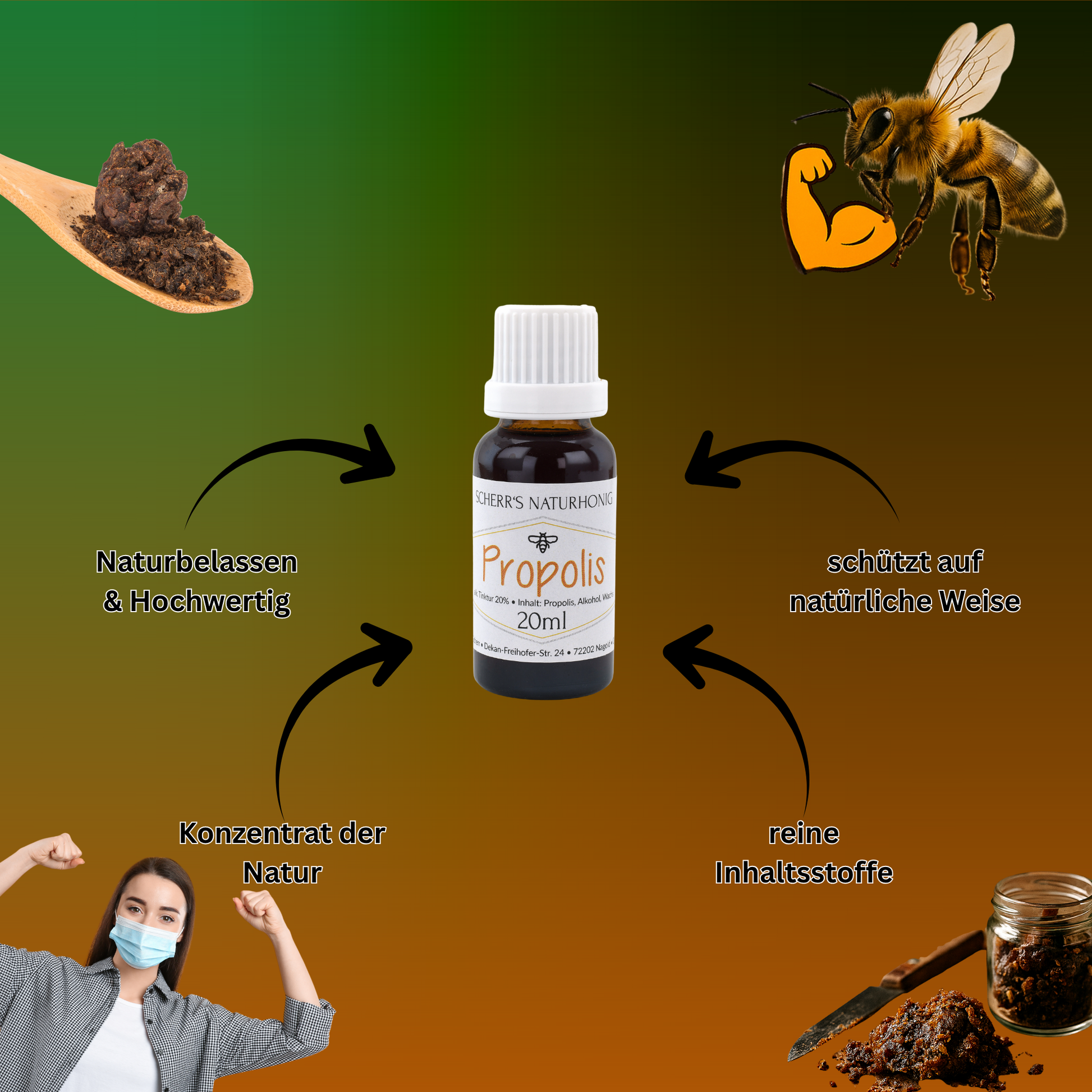 Propolis, das Schutzharz der Bienen, enthält wertvolle Flavonoide, ätherische Öle und natürliche Antioxidantien. Diese unterstützen das Immunsystem, wirken entzündungshemmend und helfen dem Körper, sich gegen Bakterien, Viren und Pilze zu schützen.